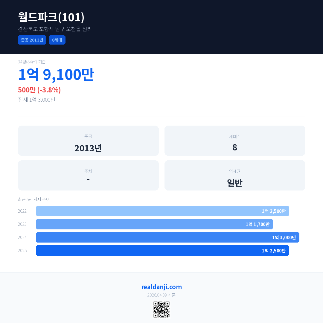월드파크(101) 최근 거래가는 1억 9,100만입니다. (2025-07)