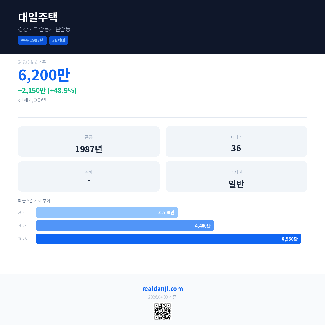 대일주택 국민평형 기준 2025년 평균 거래가는 6,550만으로, 전년 대비 48.9% 상승 했습니다.