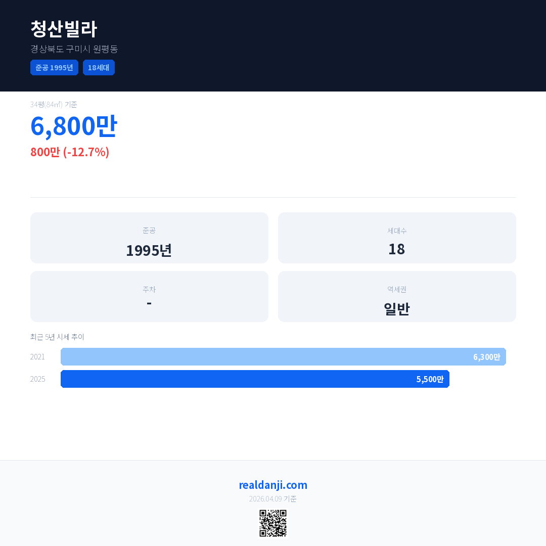 청산빌라 국민평형 기준 2025년 평균 거래가는 5,500만으로, 전년 대비 12.7% 하락 했습니다.