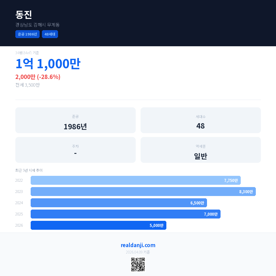 동진 국민평형 기준 2026년 평균 거래가는 5,000만으로, 전년 대비 28.6% 하락 했습니다.