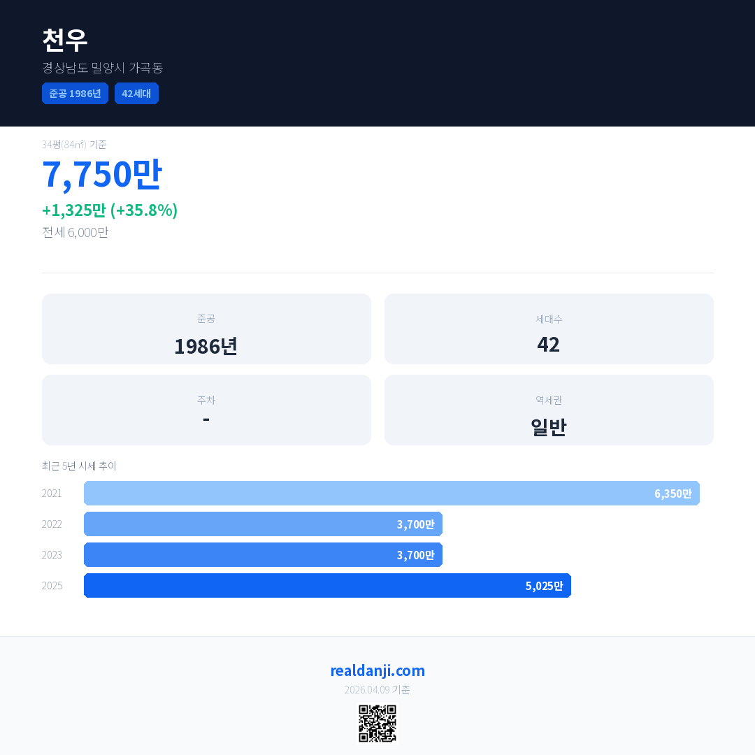 천우 국민평형 기준 2025년 평균 거래가는 5,025만으로, 전년 대비 35.8% 상승 했습니다.