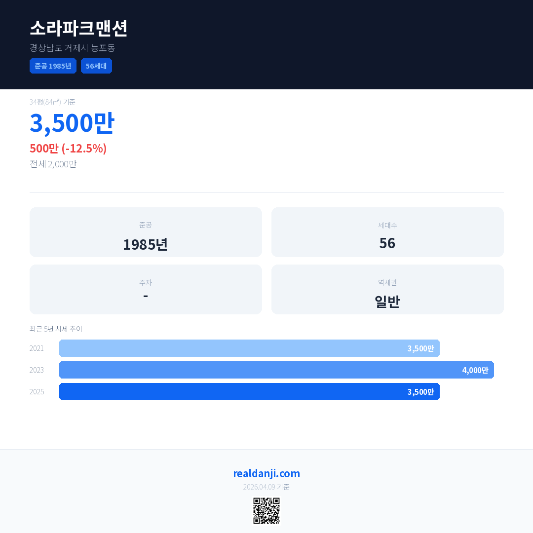 소라파크맨션 국민평형 기준 2025년 평균 거래가는 3,500만으로, 전년 대비 12.5% 하락 했습니다.