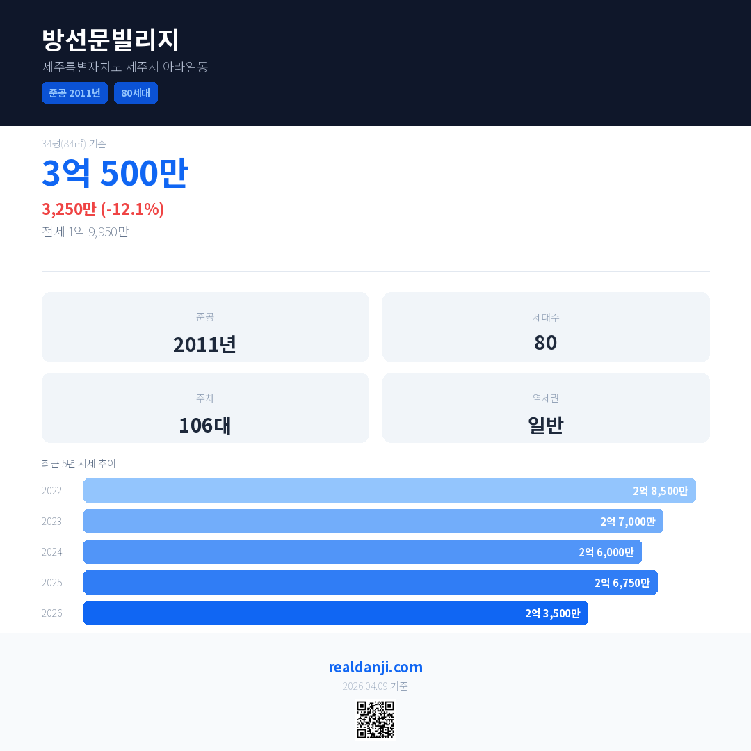 방선문빌리지 국민평형 기준 2026년 평균 거래가는 2억 3,500만으로, 전년 대비 12.1% 하락 했습니다.