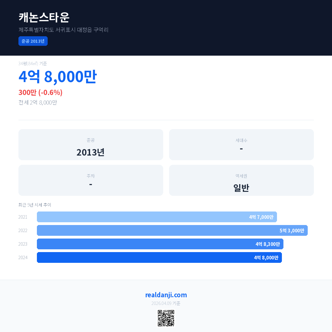 캐논스타운 국민평형 기준 2024년 평균 거래가는 4억 8,000만으로, 전년 대비 0.6% 하락 했습니다.