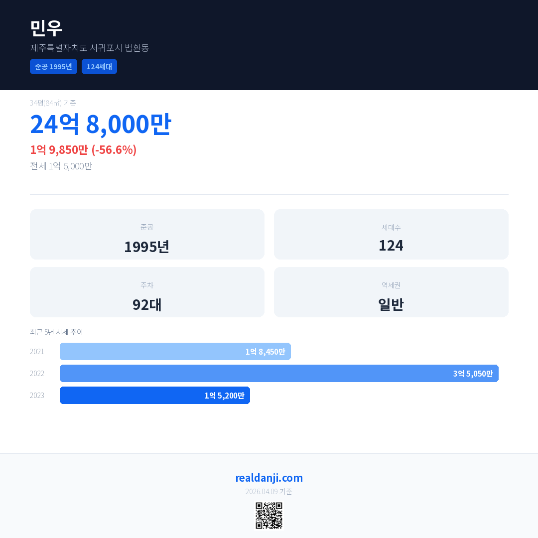 민우은(는) 1995년에 준공되었으며, 현재 31년차입니다. 총 124세대 규모입니다.