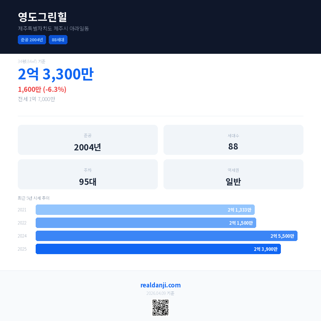 영도그린힐 국민평형 기준 2025년 평균 거래가는 2억 3,900만으로, 전년 대비 6.3% 하락 했습니다.