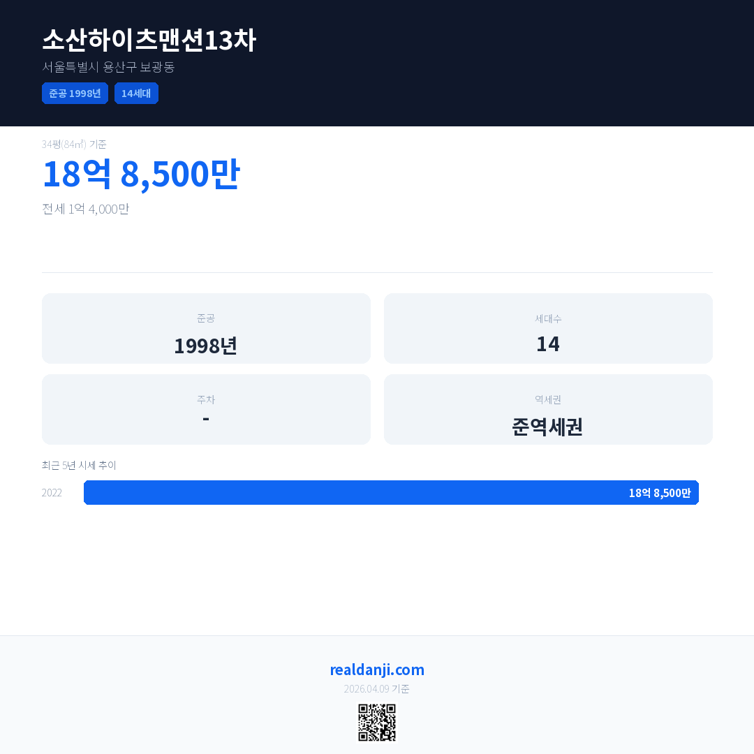 소산하이츠맨션13차은(는) 1998년에 준공되었으며, 현재 28년차입니다. 총 14세대 규모입니다.