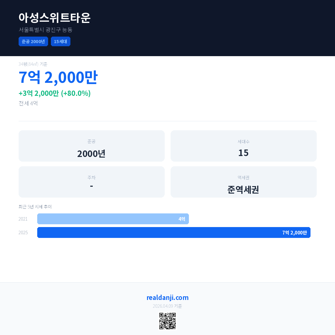 아성스위트타운 국민평형 기준 2025년 평균 거래가는 7억 2,000만으로, 전년 대비 80.0% 상승 했습니다.