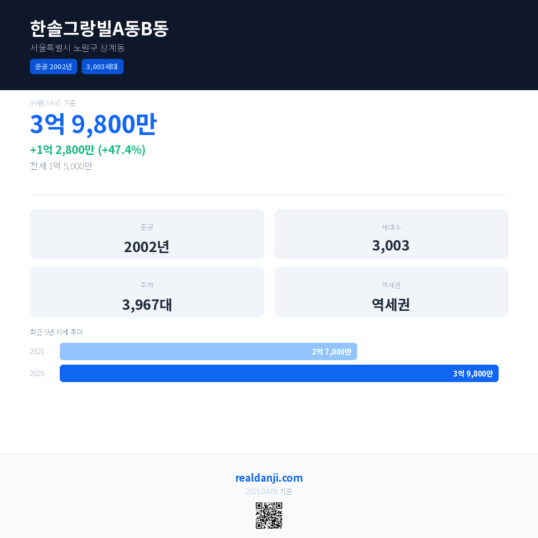 한솔그랑빌A동B동 국민평형 기준 2025년 평균 거래가는 3억 9,800만으로, 전년 대비 47.4% 상승 했습니다.