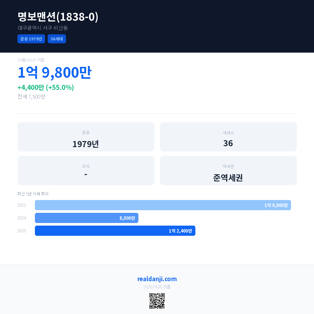 명보맨션(1838-0) 국민평형 기준 2025년 평균 거래가는 1억 2,400만으로, 전년 대비 55.0% 상승 했습니다.