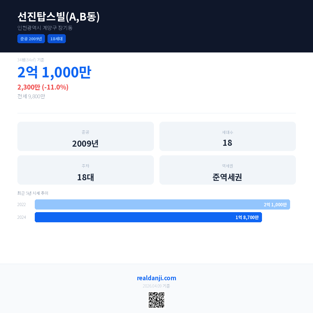 선진탑스빌(A,B동)은(는) 2009년에 준공되었으며, 현재 17년차입니다. 총 18세대 규모입니다.