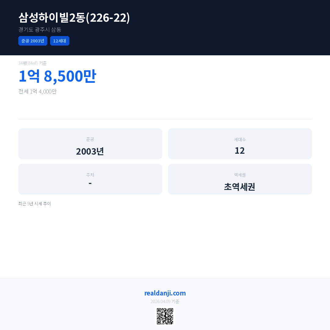 삼성하이빌2동(226-22) 최근 거래가는 1억 8,500만입니다. (2020-05)