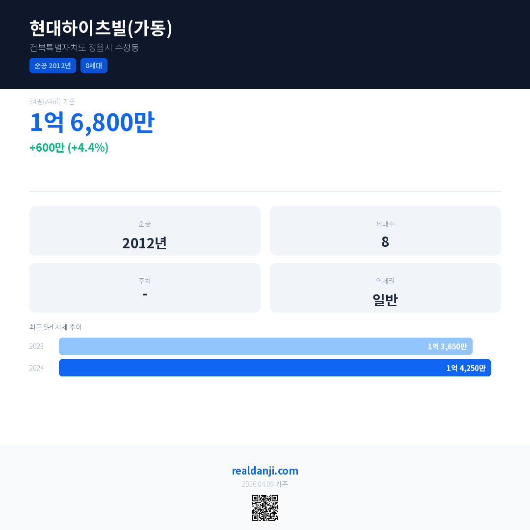 현대하이츠빌(가동) 국민평형 기준 2024년 평균 거래가는 1억 4,250만으로, 전년 대비 4.4% 상승 했습니다.