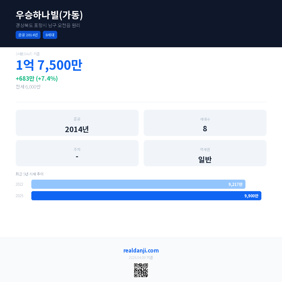 우승하나빌(가동) 국민평형 기준 2025년 평균 거래가는 9,900만으로, 전년 대비 7.4% 상승 했습니다.