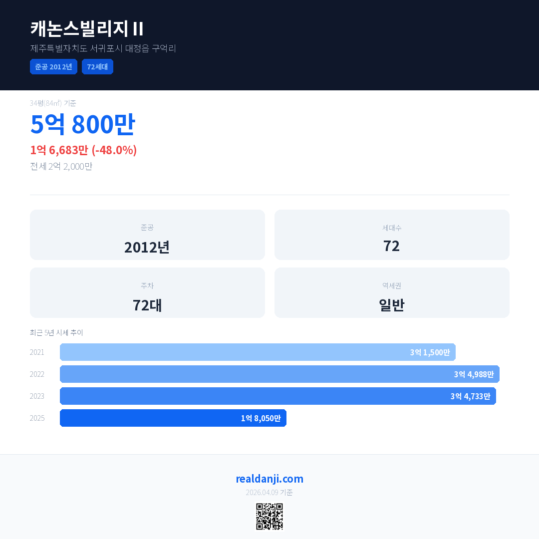 캐논스빌리지Ⅱ 국민평형 기준 2025년 평균 거래가는 1억 8,050만으로, 전년 대비 48.0% 하락 했습니다.