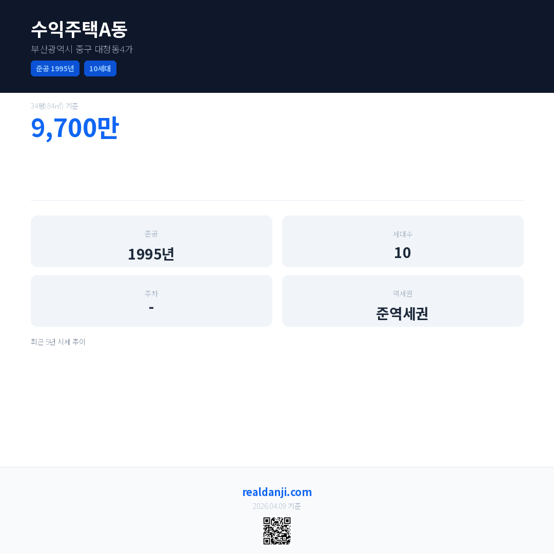 수익주택A동 최근 거래가는 9,700만입니다. (2020-04)