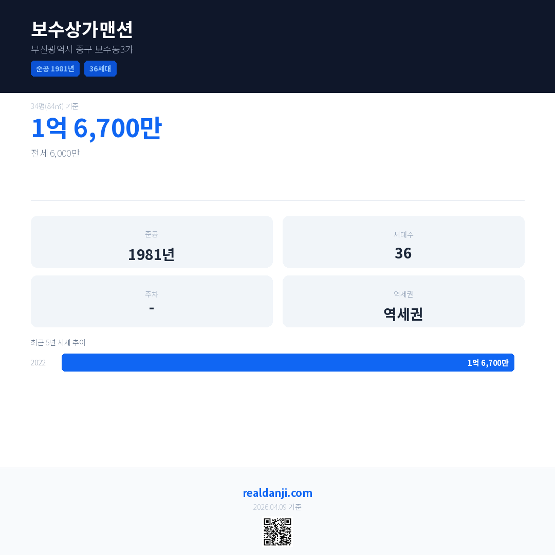 보수상가맨션은(는) 1981년에 준공되었으며, 현재 45년차입니다. 총 36세대 규모입니다.