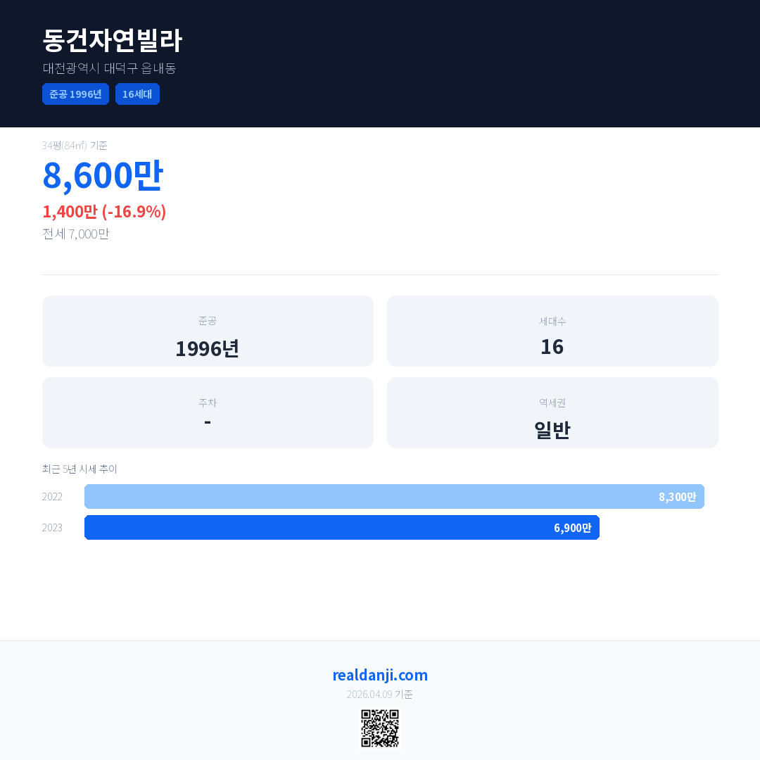 동건자연빌라 국민평형 기준 2023년 평균 거래가는 6,900만으로, 전년 대비 16.9% 하락 했습니다.
