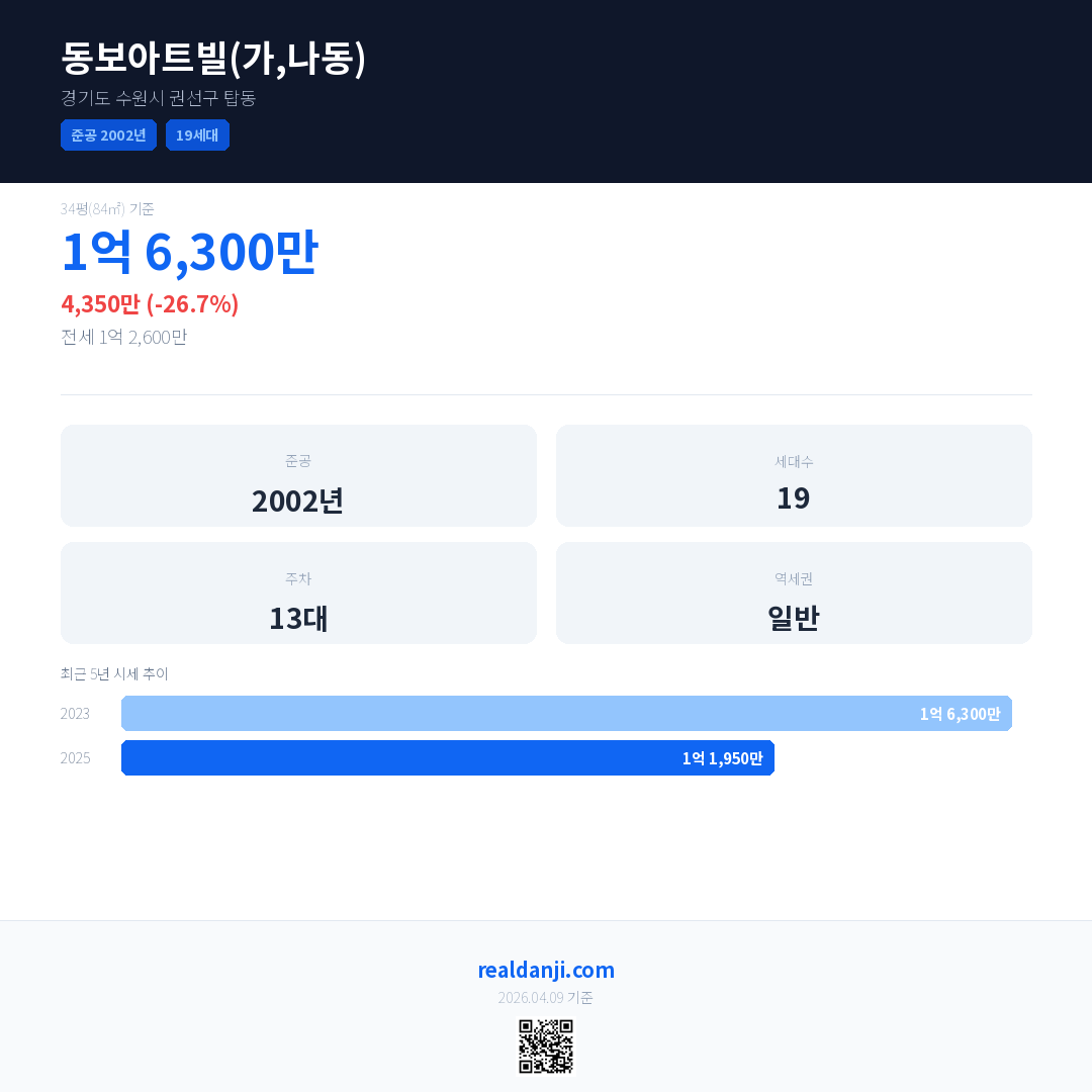 동보아트빌(가,나동) 최근 거래가는 1억 6,300만입니다. (2025-06)
