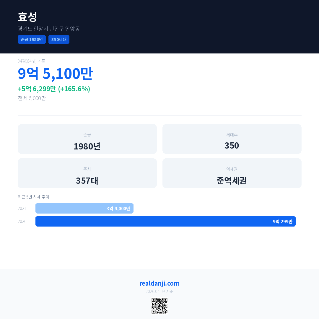 효성은(는) 1980년에 준공되었으며, 현재 46년차입니다. 총 350세대 규모입니다.