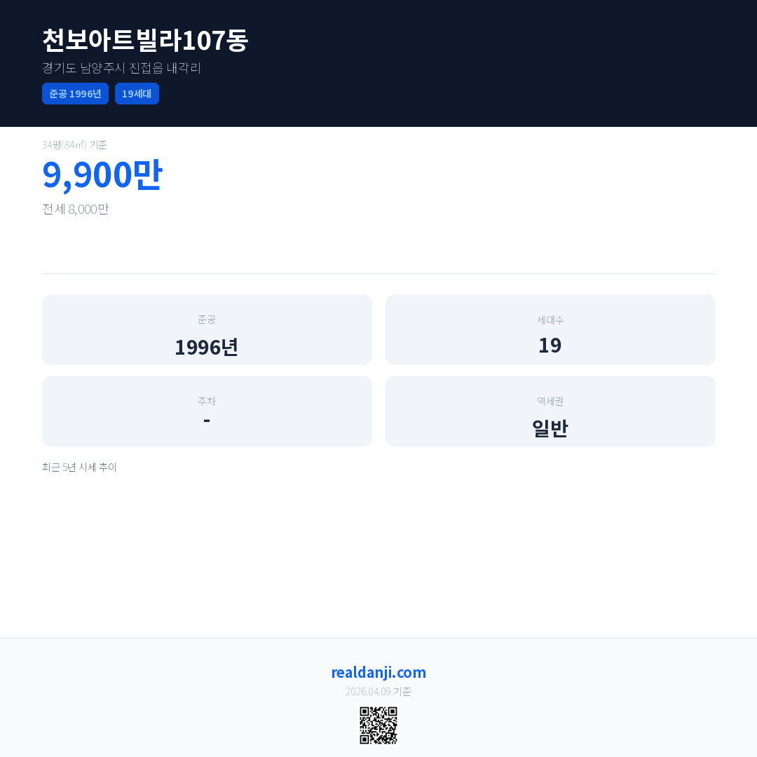 천보아트빌라107동은(는) 1996년에 준공되었으며, 현재 30년차입니다. 총 19세대 규모입니다.