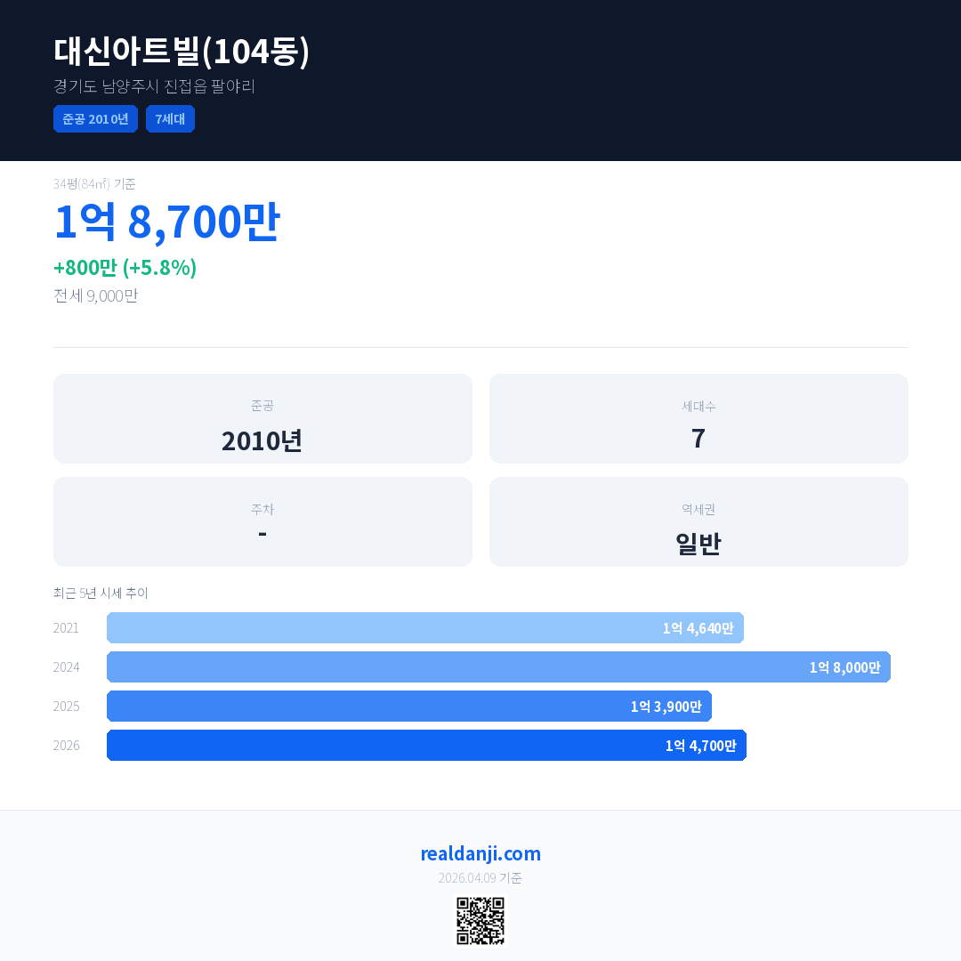 대신아트빌(104동) 최근 거래가는 1억 8,700만입니다. (2026-03)