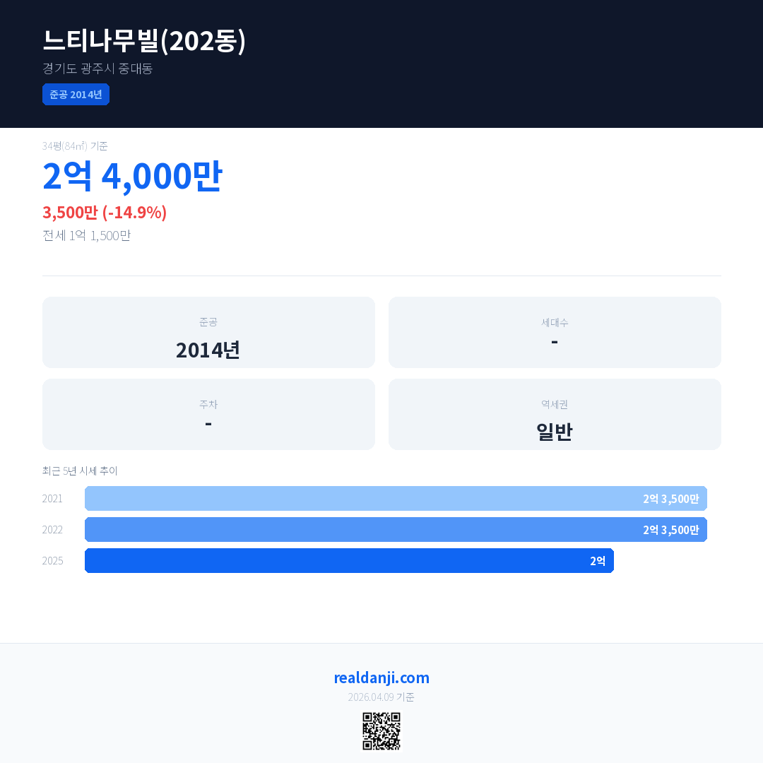 느티나무빌(202동) 국민평형 기준 2025년 평균 거래가는 2억으로, 전년 대비 14.9% 하락 했습니다.