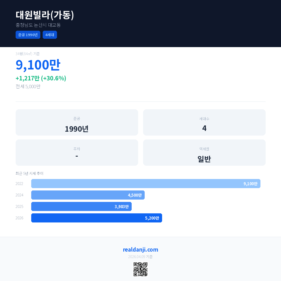 대원빌라(가동) 최근 거래가는 9,100만입니다. (2026-03)