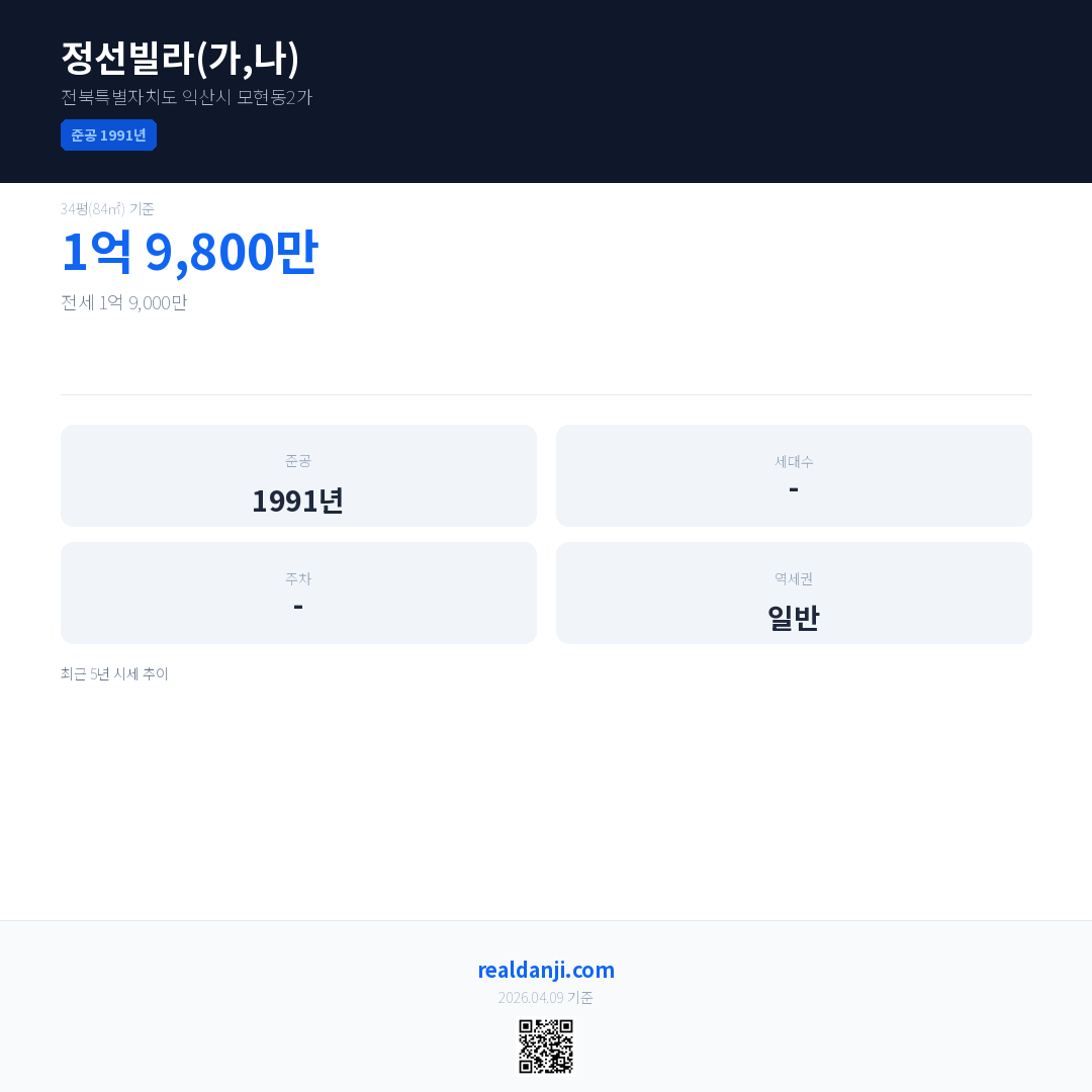 정선빌라(가,나)은(는) 1991년에 준공되었으며, 현재 35년차입니다.