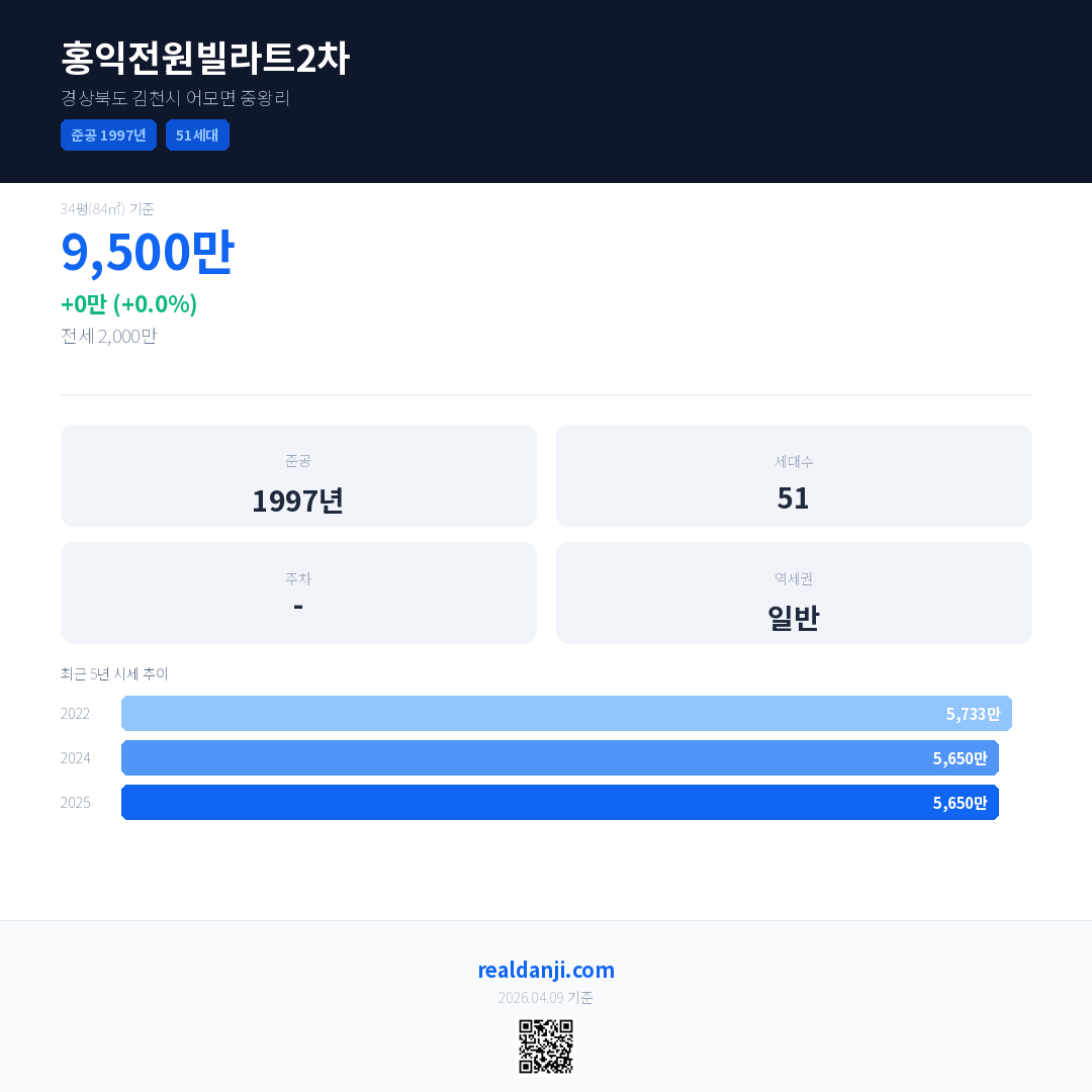 홍익전원빌라트2차 국민평형 기준 2025년 평균 거래가는 5,650만으로, 전년 대비 0.0% 하락 했습니다.