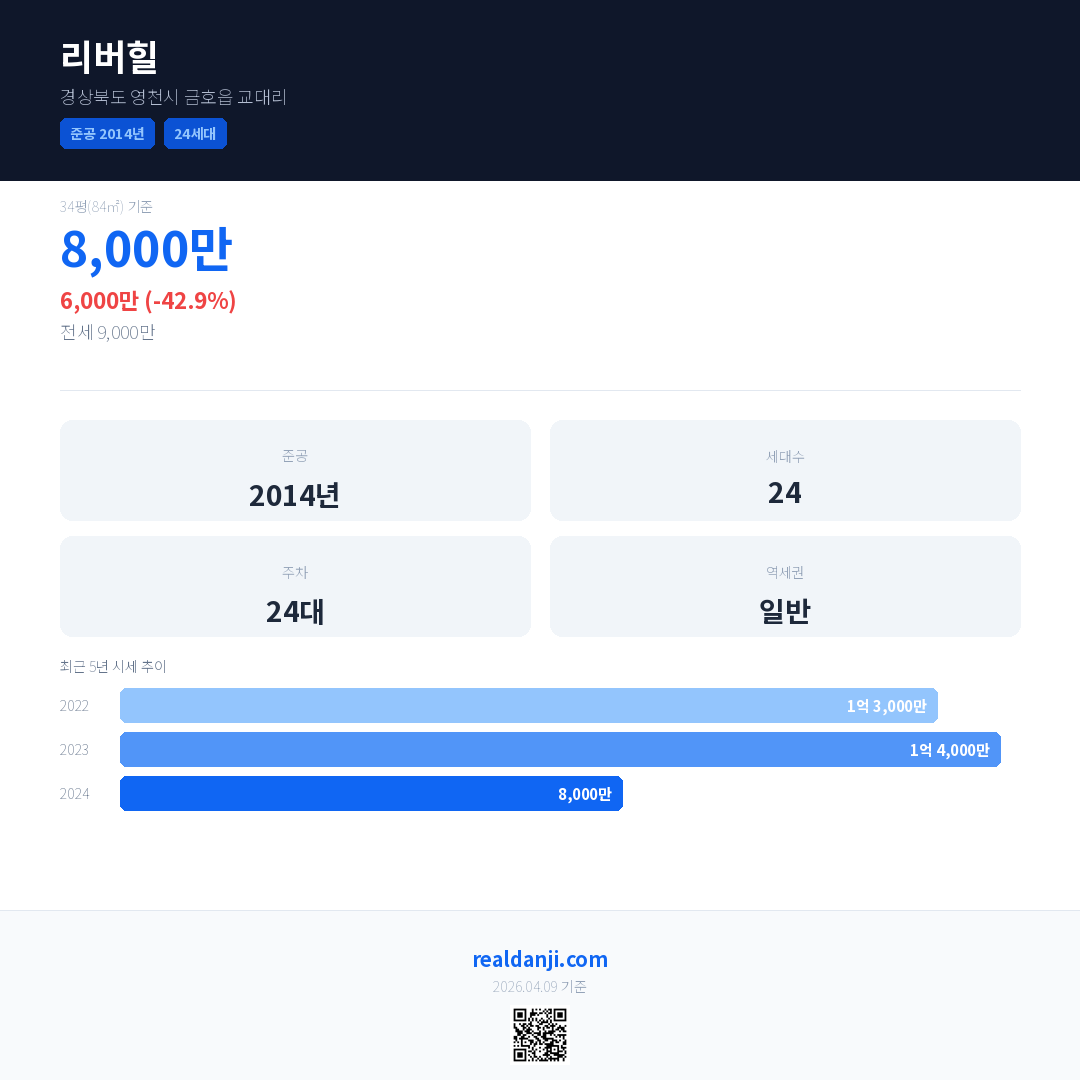리버힐 국민평형 기준 2024년 평균 거래가는 8,000만으로, 전년 대비 42.9% 하락 했습니다.