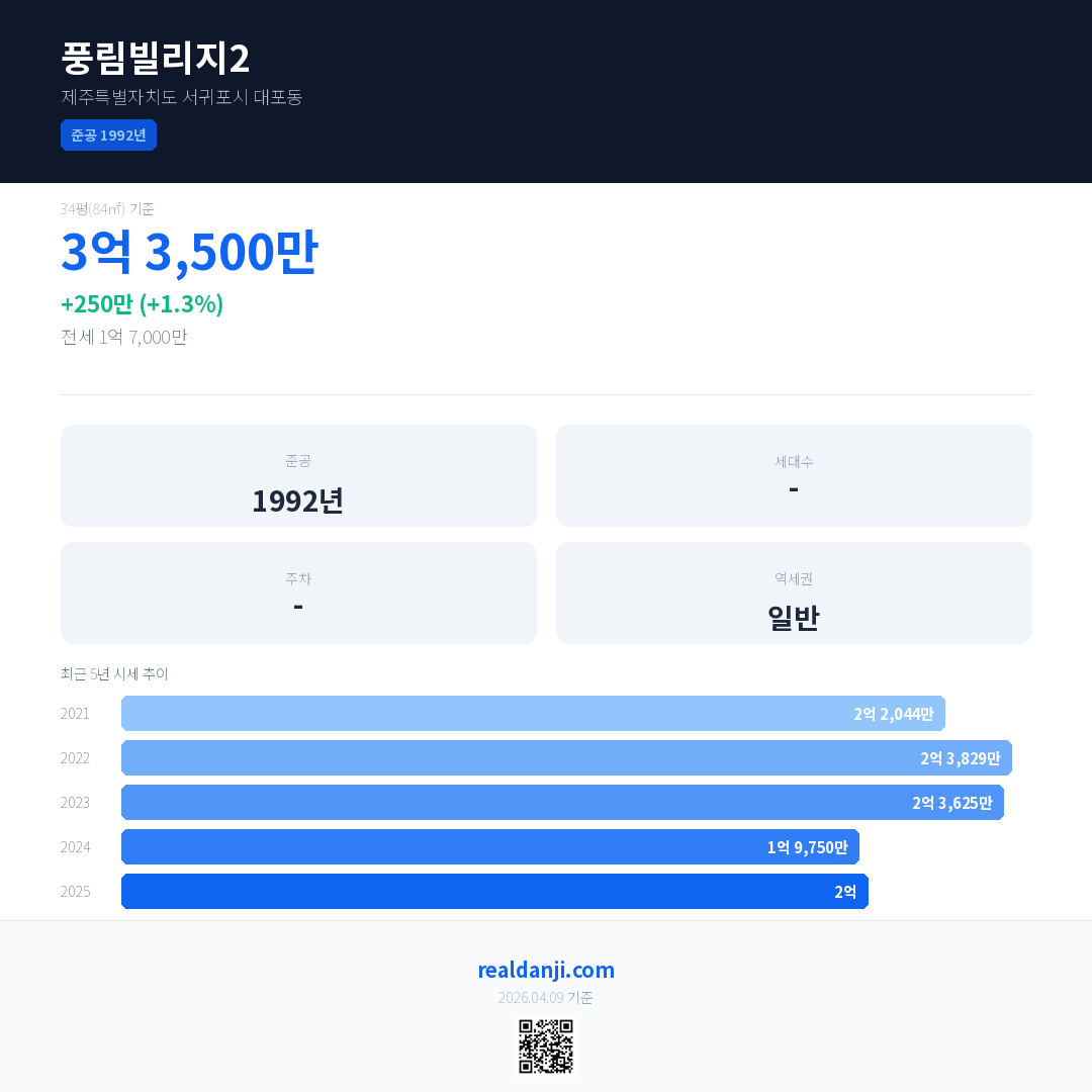 풍림빌리지2 국민평형 기준 2025년 평균 거래가는 2억으로, 전년 대비 1.3% 상승 했습니다.