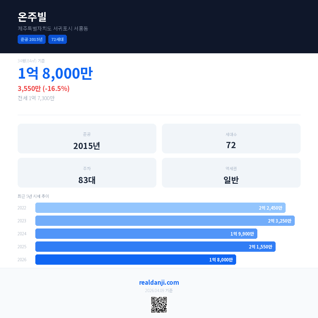 온주빌 국민평형 기준 2026년 평균 거래가는 1억 8,000만으로, 전년 대비 16.5% 하락 했습니다.