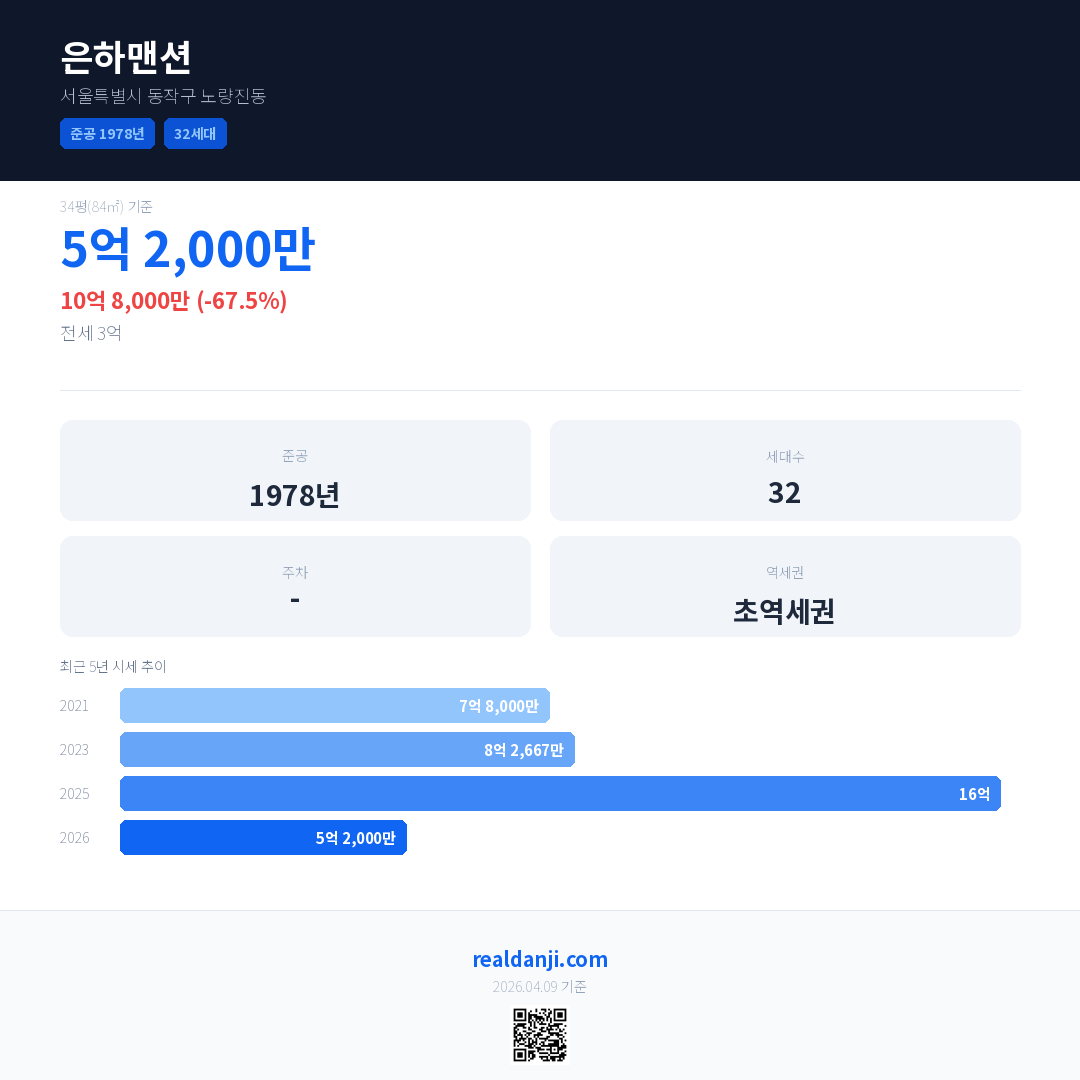 은하맨션 국민평형 기준 2026년 평균 거래가는 5억 2,000만으로, 전년 대비 67.5% 하락 했습니다.