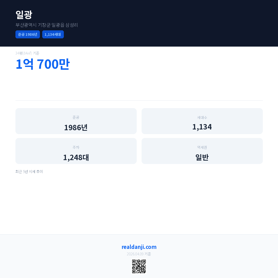일광은(는) 1986년에 준공되었으며, 현재 40년차입니다. 총 1,134세대 규모입니다.
