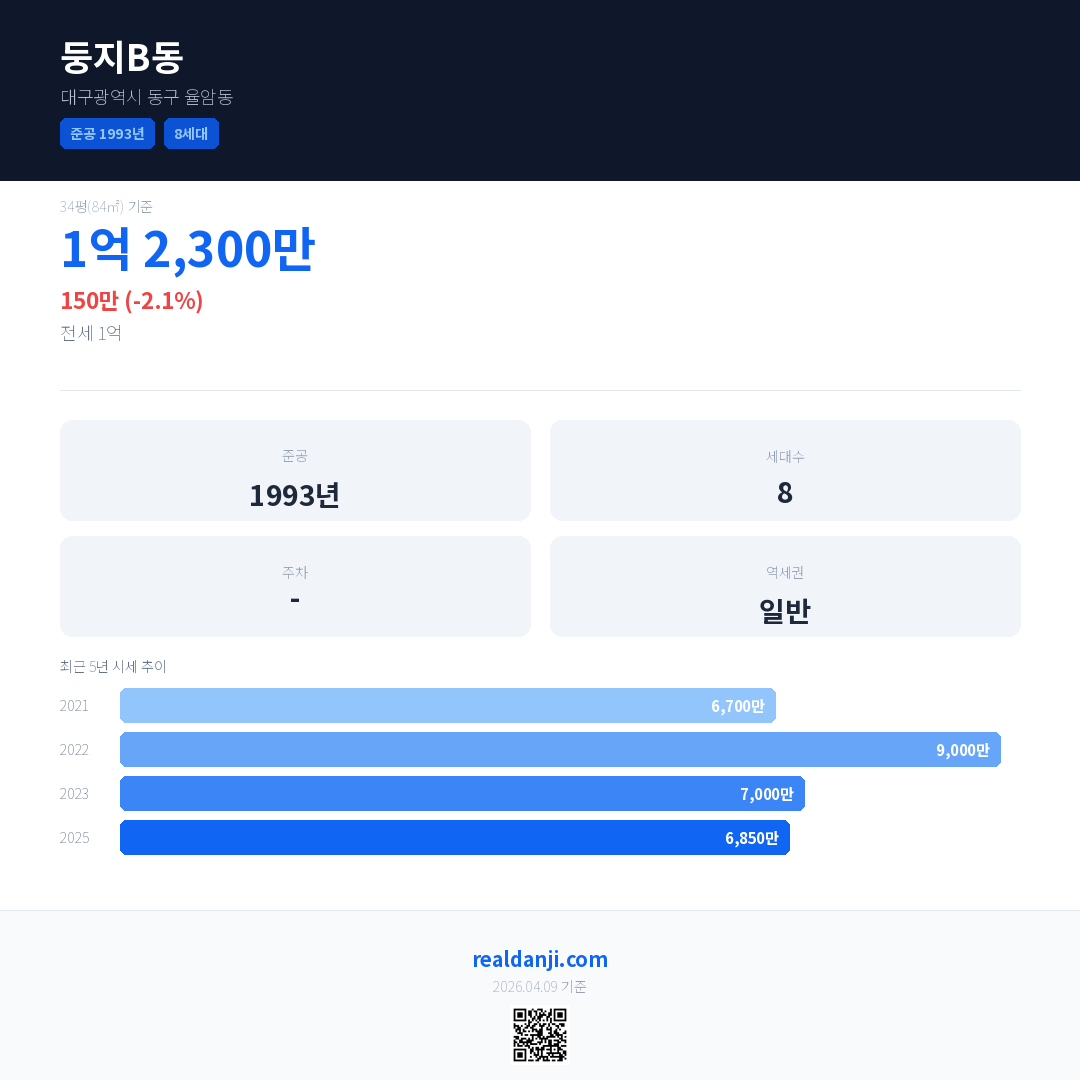 둥지B동 국민평형 기준 2025년 평균 거래가는 6,850만으로, 전년 대비 2.1% 하락 했습니다.