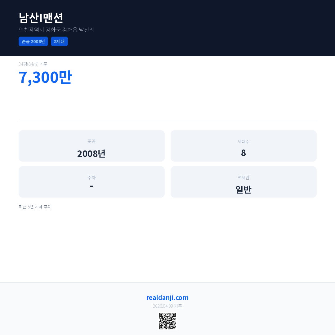 남산I맨션 최근 거래가는 7,300만입니다. (2024-04)
