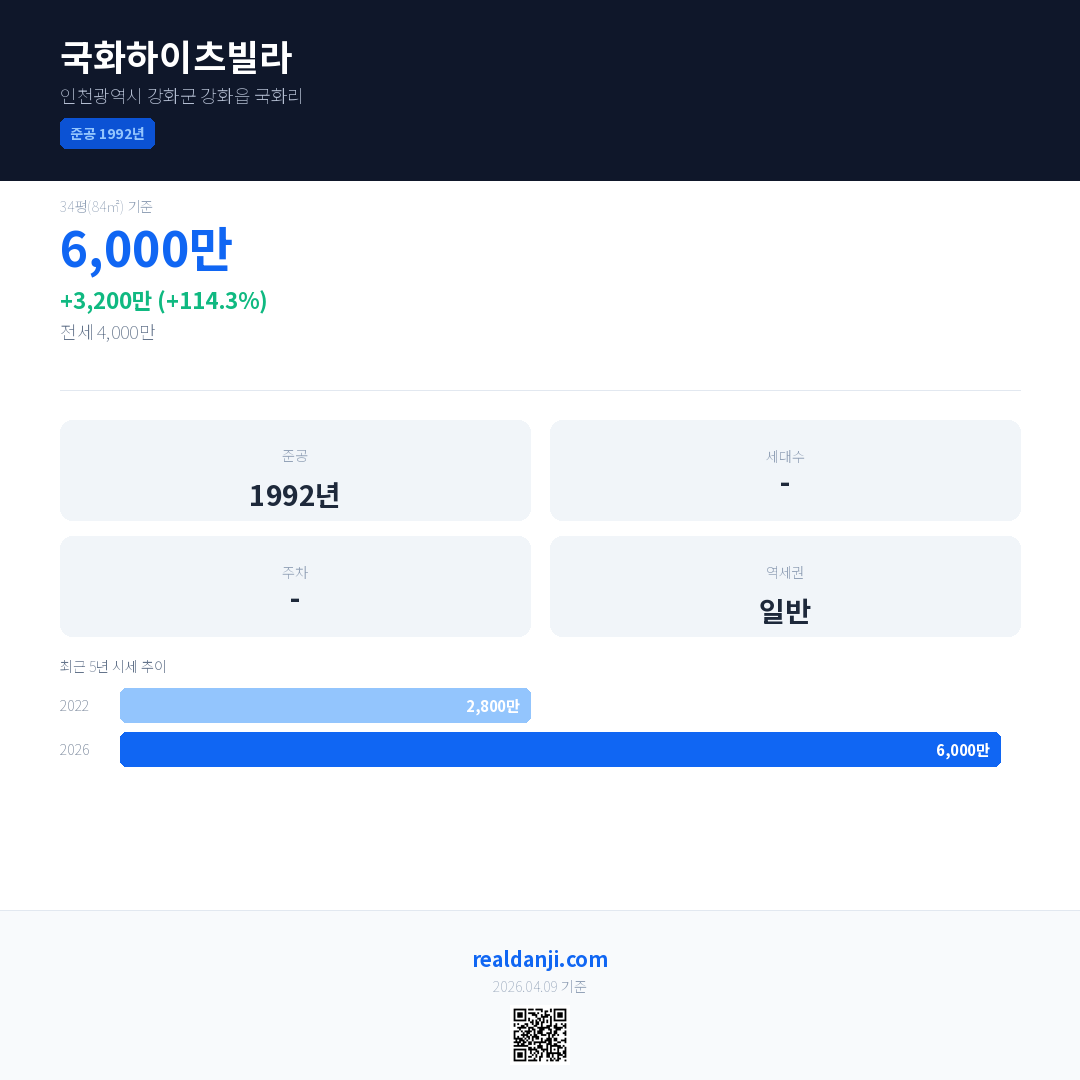 국화하이츠빌라 국민평형 기준 2026년 평균 거래가는 6,000만으로, 전년 대비 114.3% 상승 했습니다.