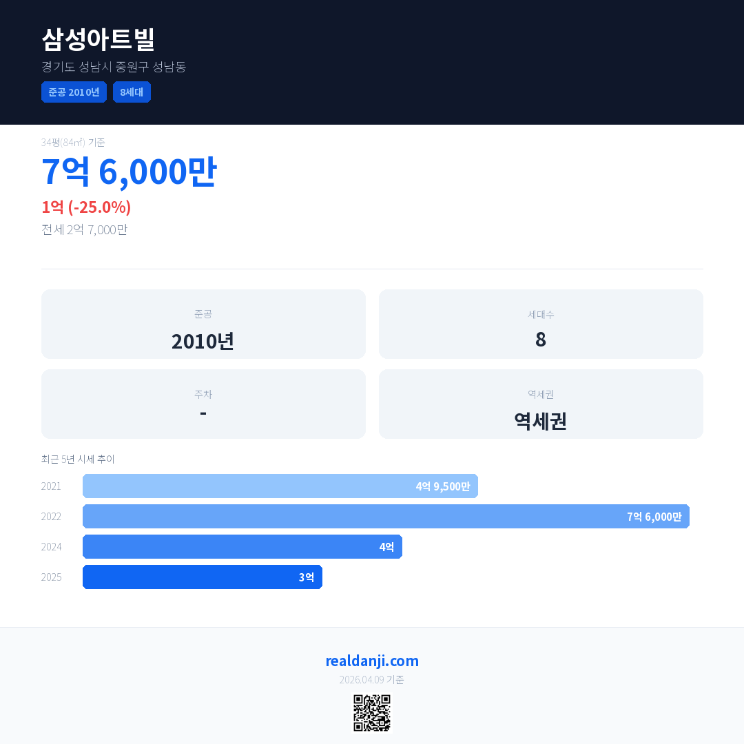 삼성아트빌 국민평형 기준 2025년 평균 거래가는 3억으로, 전년 대비 25.0% 하락 했습니다.