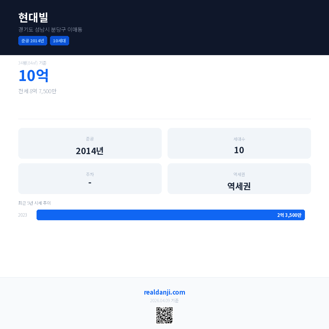 현대빌은(는) 2014년에 준공되었으며, 현재 12년차입니다. 총 10세대 규모입니다.