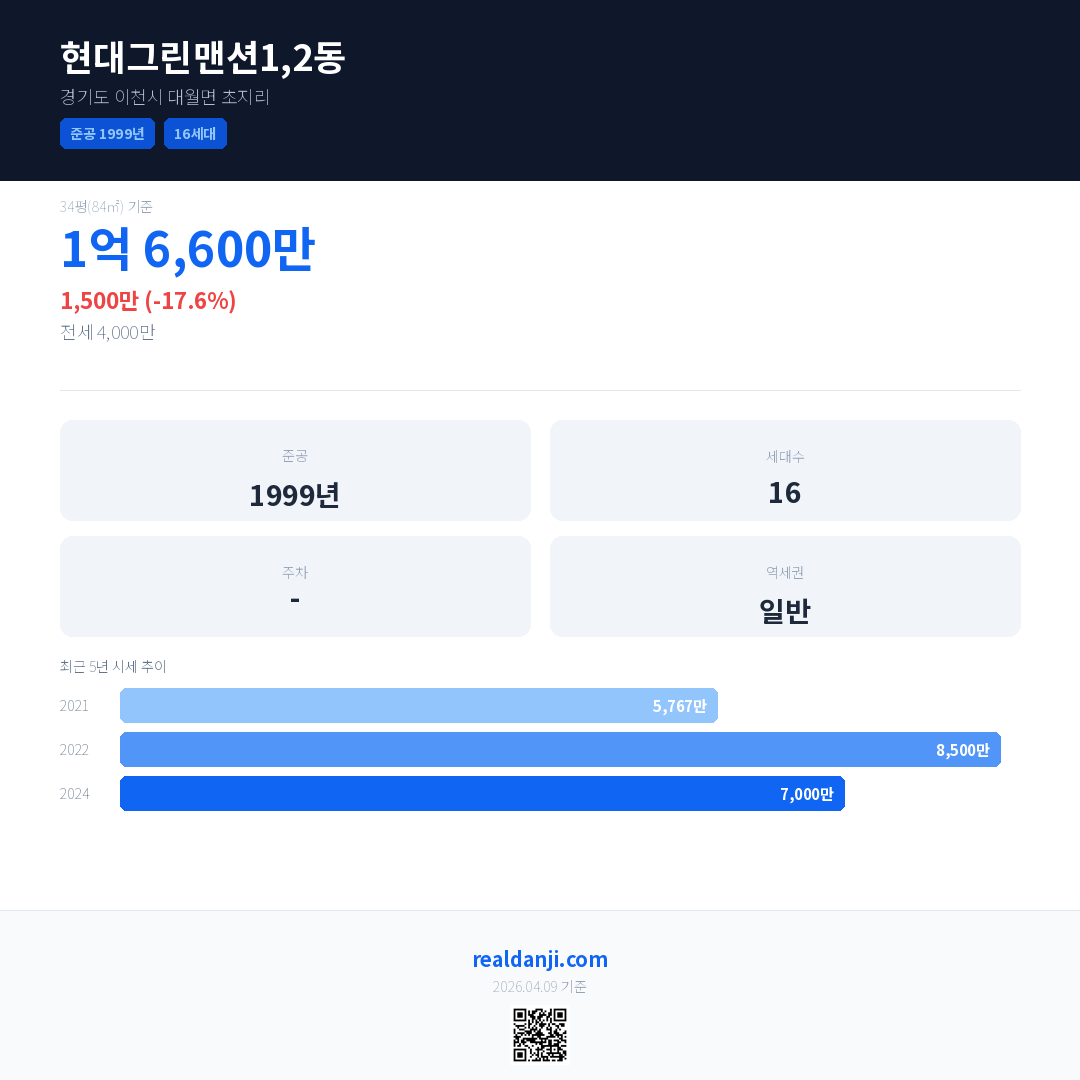 현대그린맨션1,2동 최근 거래가는 1억 6,600만입니다. (2024-05)