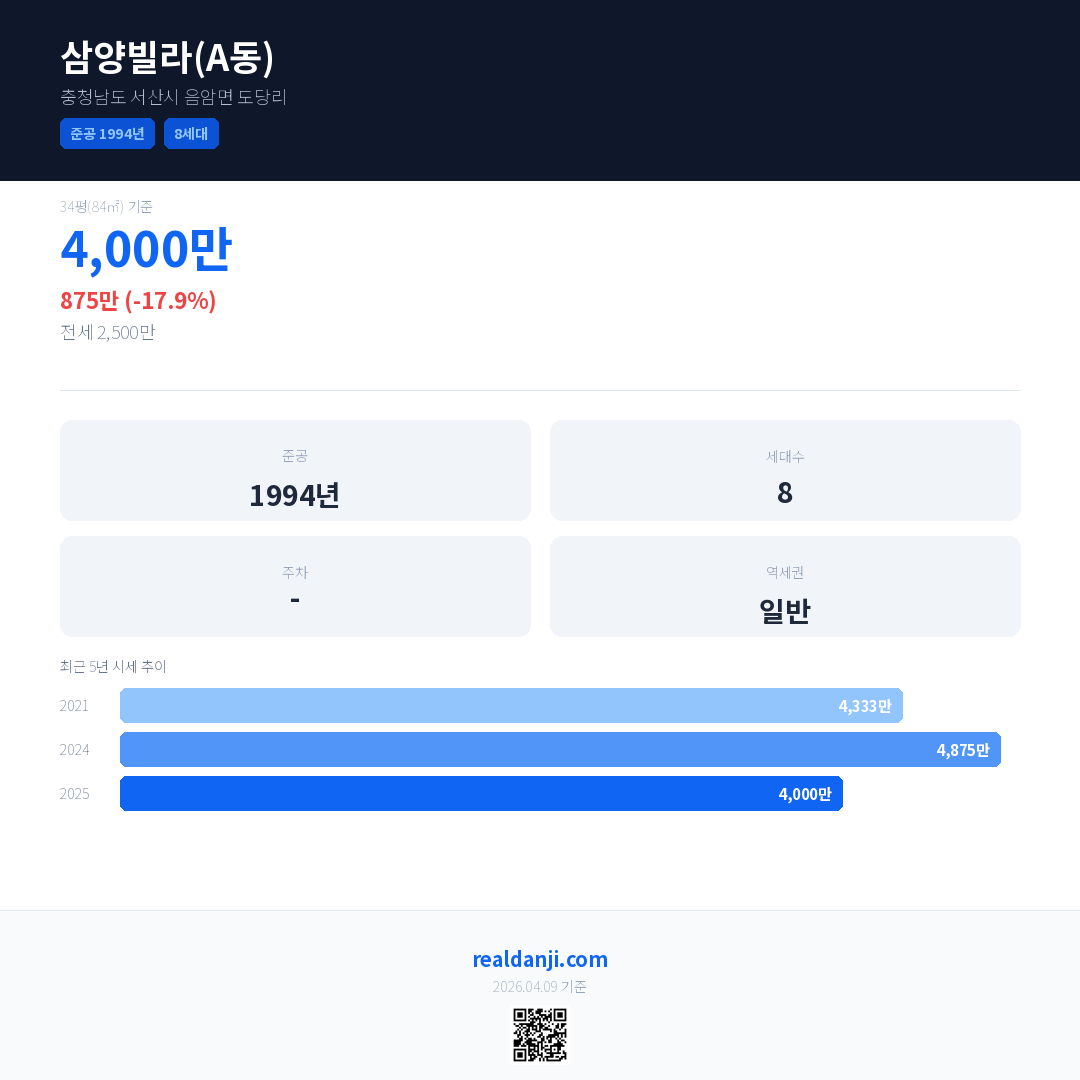 삼양빌라(A동) 국민평형 기준 2025년 평균 거래가는 4,000만으로, 전년 대비 17.9% 하락 했습니다.
