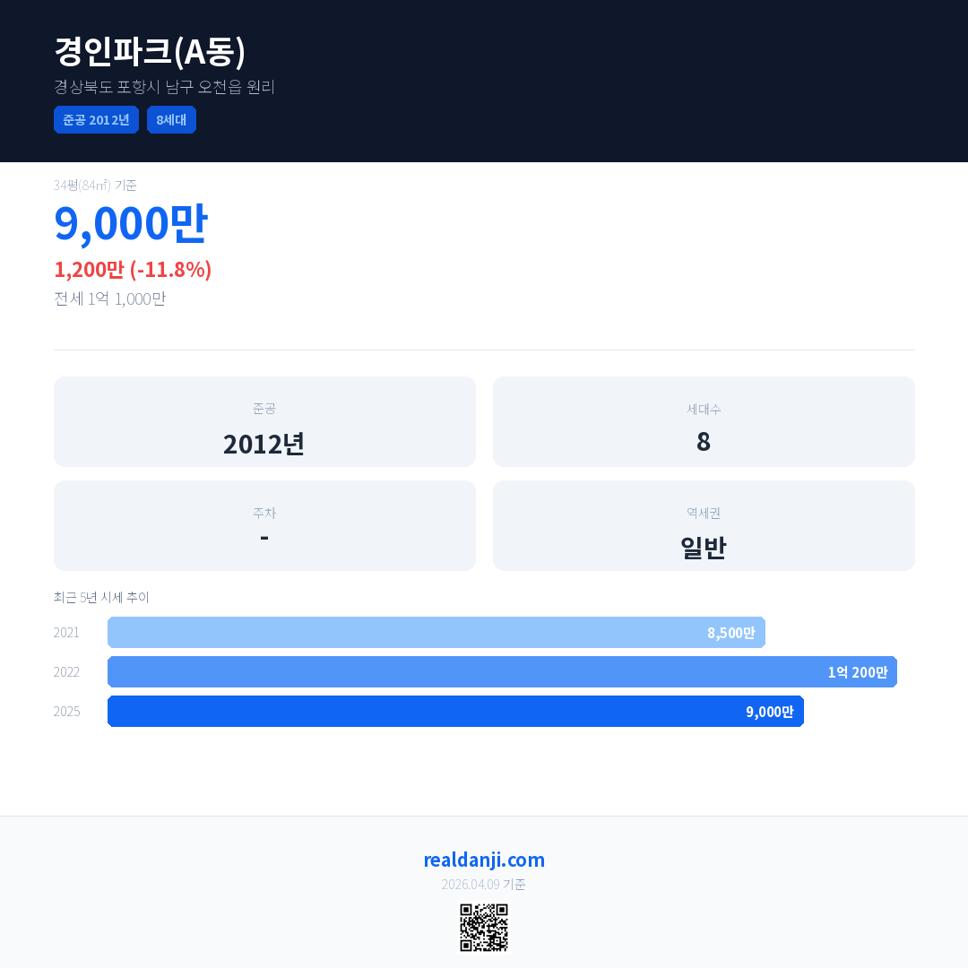 경인파크(A동) 국민평형 기준 2025년 평균 거래가는 9,000만으로, 전년 대비 11.8% 하락 했습니다.