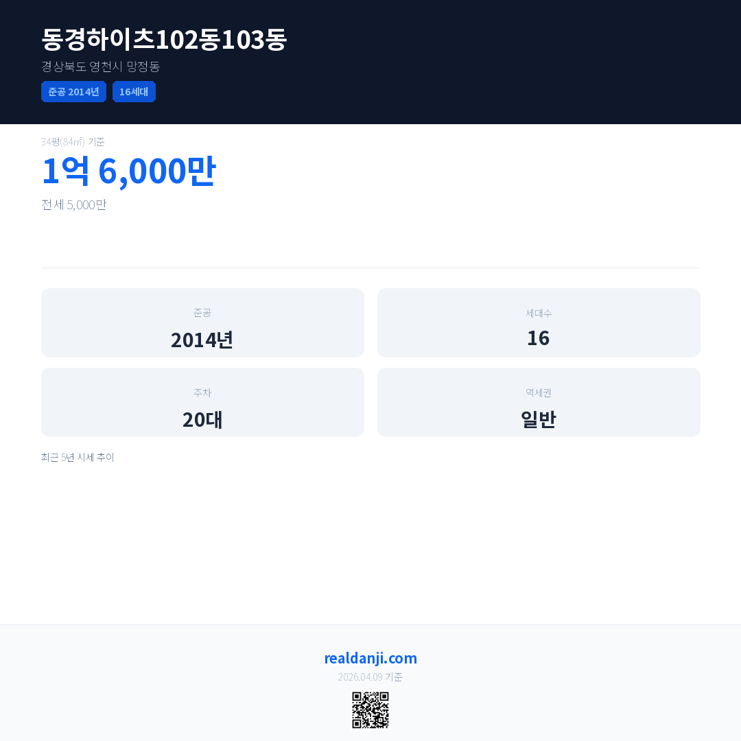 동경하이츠102동103동 최근 거래가는 1억 6,000만입니다. (2019-12)