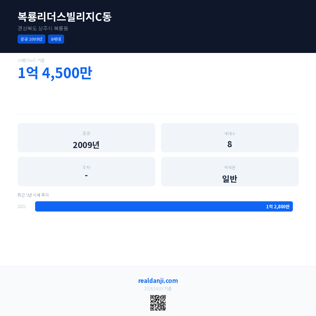 복룡리더스빌리지C동 최근 거래가는 1억 4,500만입니다. (2021-02)