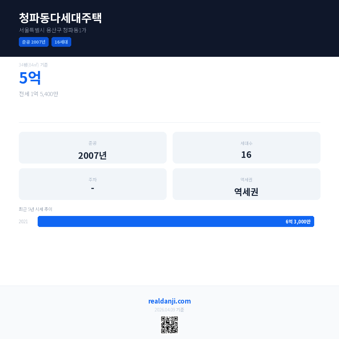 청파동다세대주택은(는) 2007년에 준공되었으며, 현재 19년차입니다. 총 16세대 규모입니다.