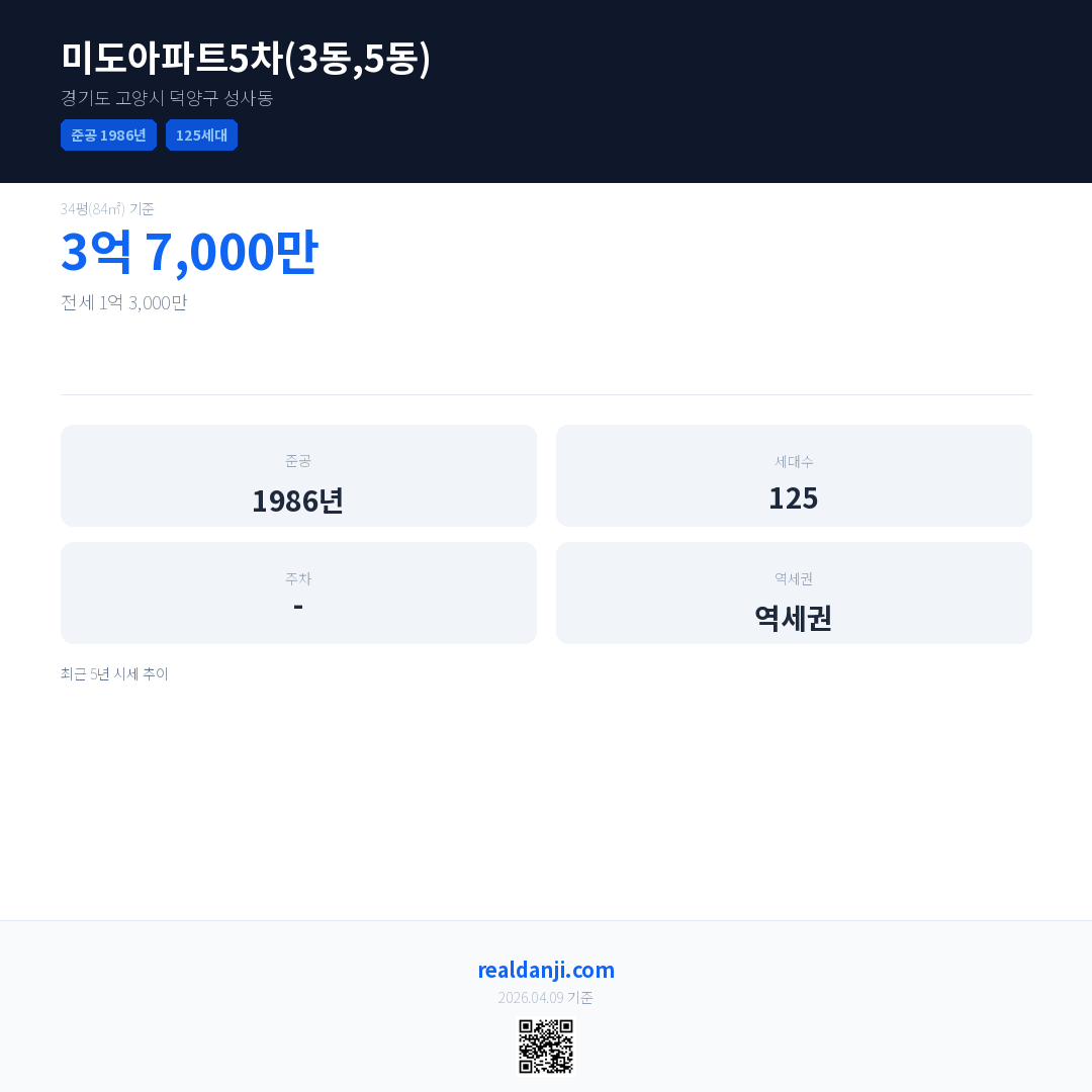 미도아파트5차(3동,5동) 최근 거래가는 3억 7,000만입니다. (2025-12)