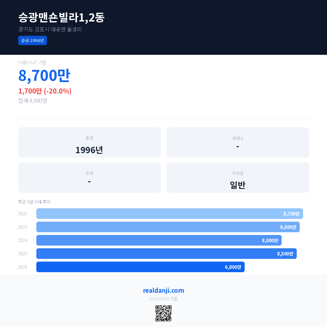 승광맨숀빌라1,2동 국민평형 기준 2026년 평균 거래가는 6,800만으로, 전년 대비 20.0% 하락 했습니다.
