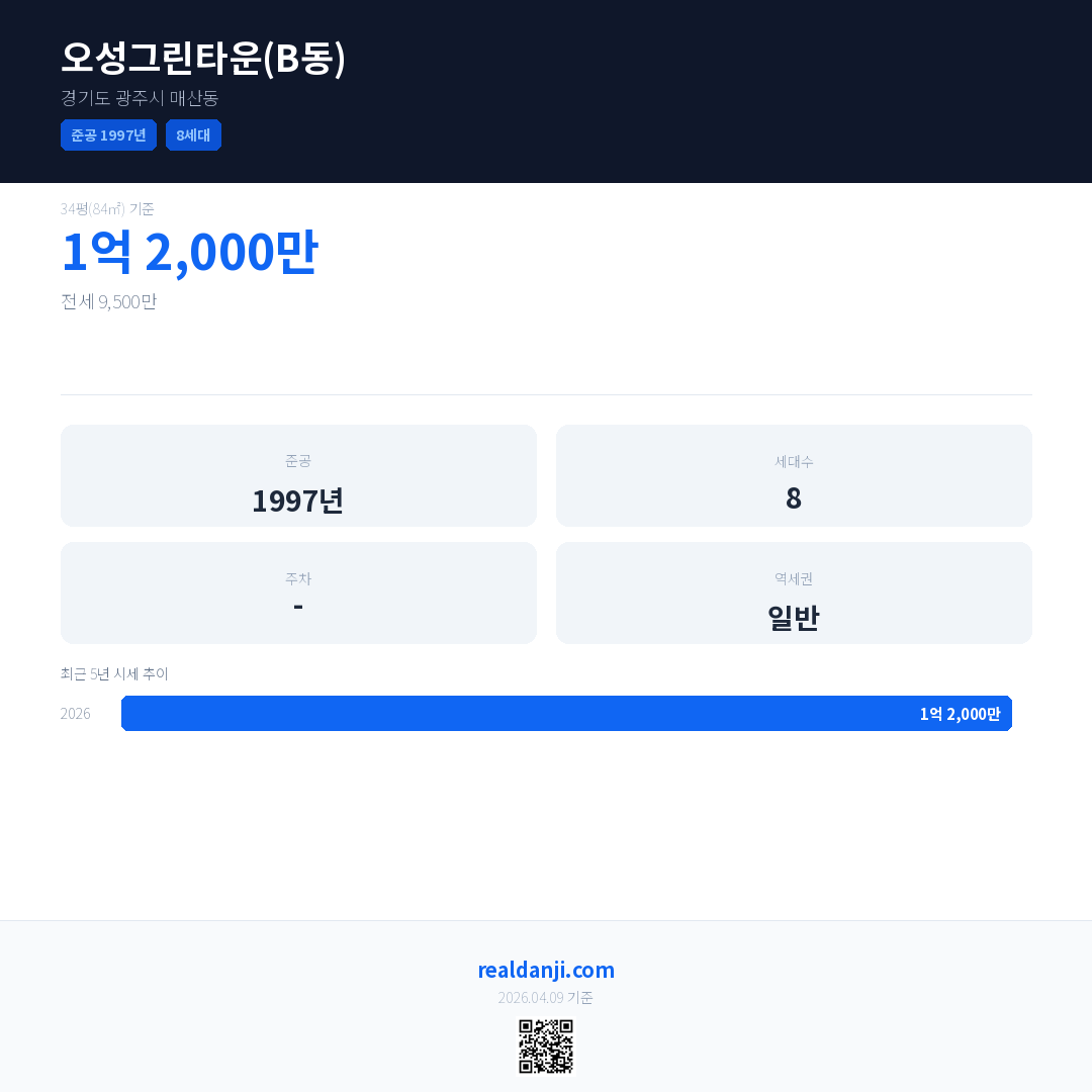 오성그린타운(B동) 최근 거래가는 1억 9,000만입니다. (2026-04)