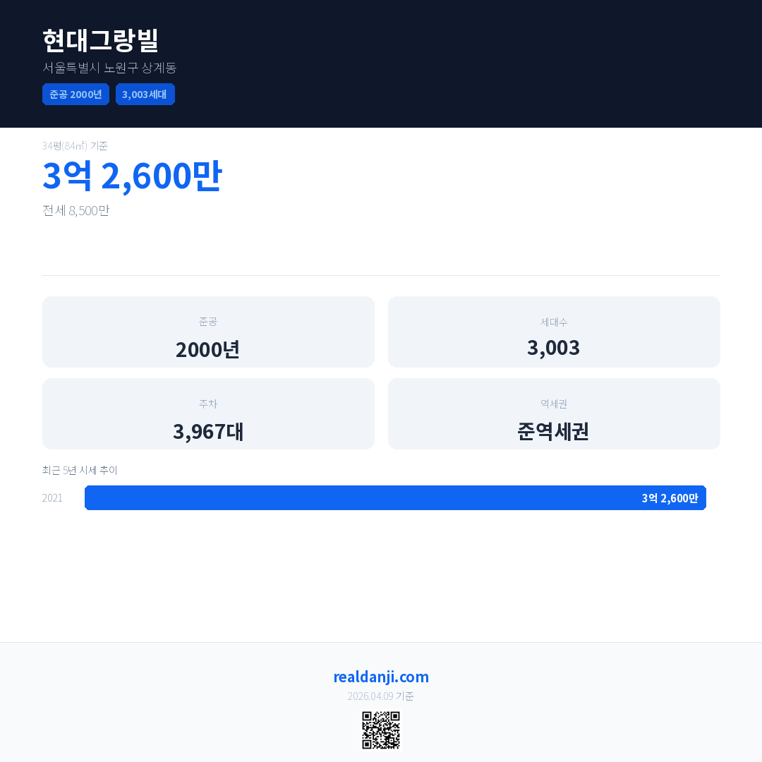 현대그랑빌은(는) 2000년에 준공되었으며, 현재 26년차입니다. 총 3,003세대 규모입니다.